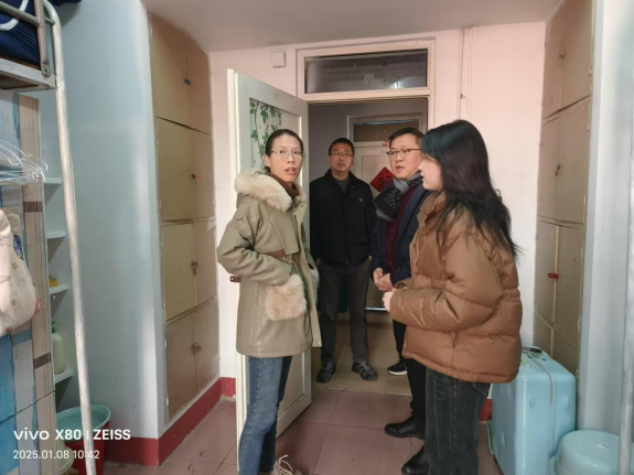 2025年1月8日上午,0638太阳集团党委书记蔡飞、副书记杨思迪、学生科科长丁侃及全体辅导员一同前往学生宿舍,开展寒假前的安全检查工作。